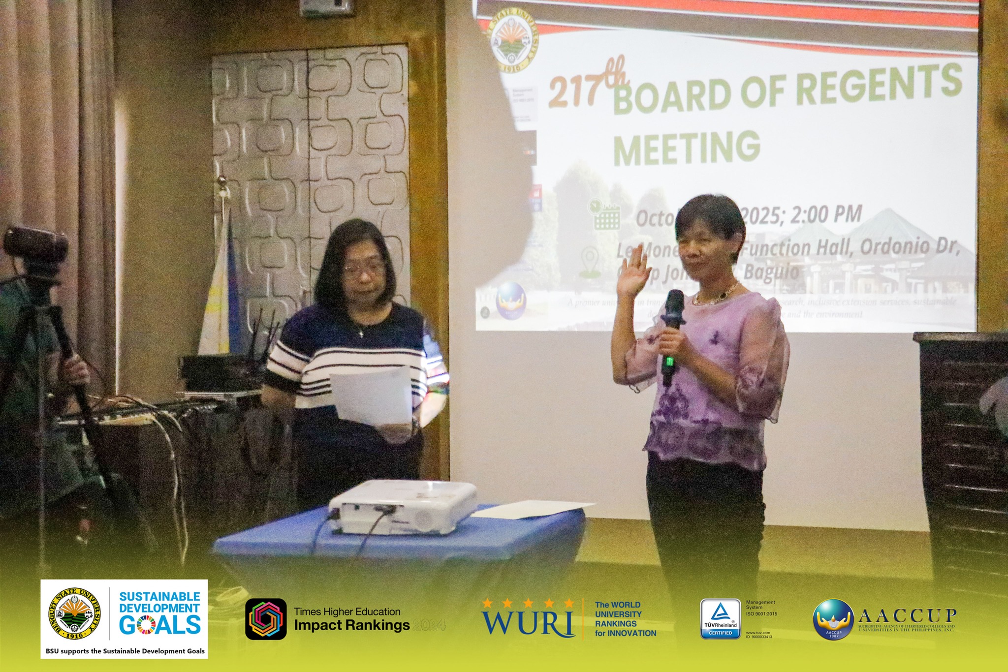 The Benguet State University (BSU) Board of Regents (BOR) convened its 217th Regular Meeting at Le Monet Hotel, Camp John Hay, Baguio City on October 14, 2025 to deliberate and approve major policies and programs in administration and finance, academics, research and extension, and business affairs.