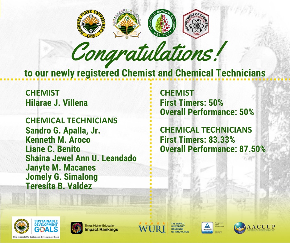 The Benguet State University (BSU) College of Natural Sciences (CNS), through its Department of Chemistry, proudly announced the success of its examinees in the recent October 2025 Chemist and Chemical Technician Licensure Examinations. The university produced a total of eight new licensed professionals who passed the rigorous exams administered by the Professional Regulation Commission (PRC). continue reading : BSU Celebrates New Crop of Chemist and Chemical Technicians in October 2025 Licensure Exams